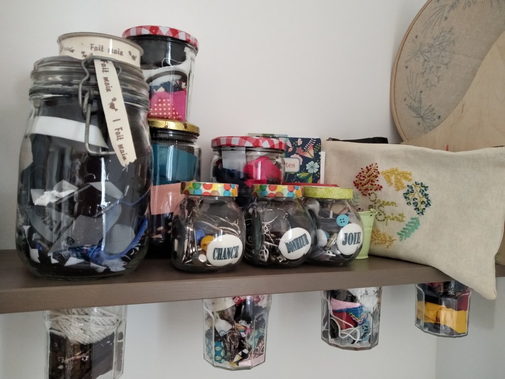 Au dessus du bureau, j’ai sur une étagère toutes les fournitures qu’on ne sait pas où stocker! Biais et galons sont dans des pots de confiture vissés, fermetures, sangles, élastiques, boucles métalliques et boutons sont dans des bocaux au dessus. Vous apercevez ma trousse de brodeuse.