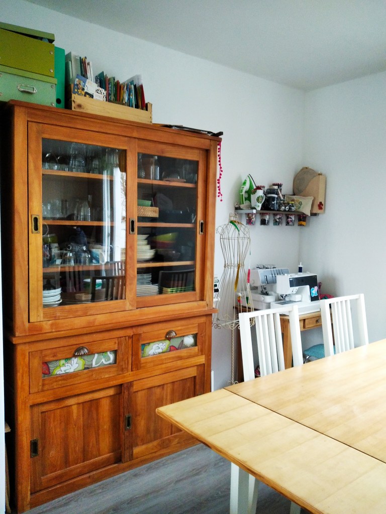 Depuis longtemps, j’ai installé un petit bureau dans ce coin de la salle à manger pour y stocker machines, en-cours et matériel. Lorsque je couds, j’investis la table de la salle à manger (et oblige toute la famille à se retrancher dans la cuisine ! )