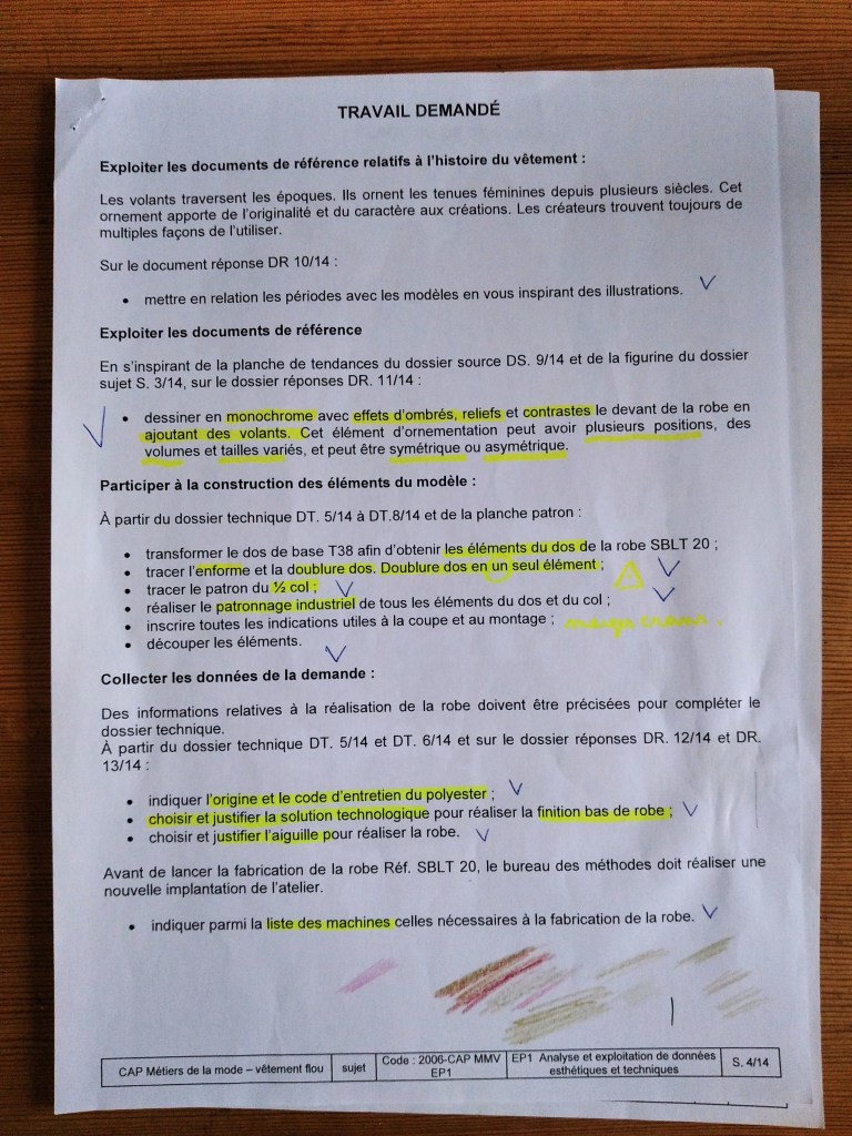 Au niveau du patronage, on nous distribue des grandes feuilles de papier sur lesquelles tracer les différentes pièces demandées tout en n’omettant pas de les identifier de façon industrielle (nom des pièces, numéro des pièces correspondant à la planche patron, ajout des valeurs de couture, droit fil…) J’attends toujours la correction sur ce point car j’ai de gros doutes sur ma proposition et ma note laisse entendre que j’ai perdu des points sur cette question. Comme vous le voyez ci-dessus, je vous conseille de surligner les éléments importants, de cocher au fur et à mesure des éléments réalisés car on peut vite oublier un élément. Ici on avait la demande de tracer le dos en un seul élément d’où l’importance d’étudier attentivement le dessin technique.