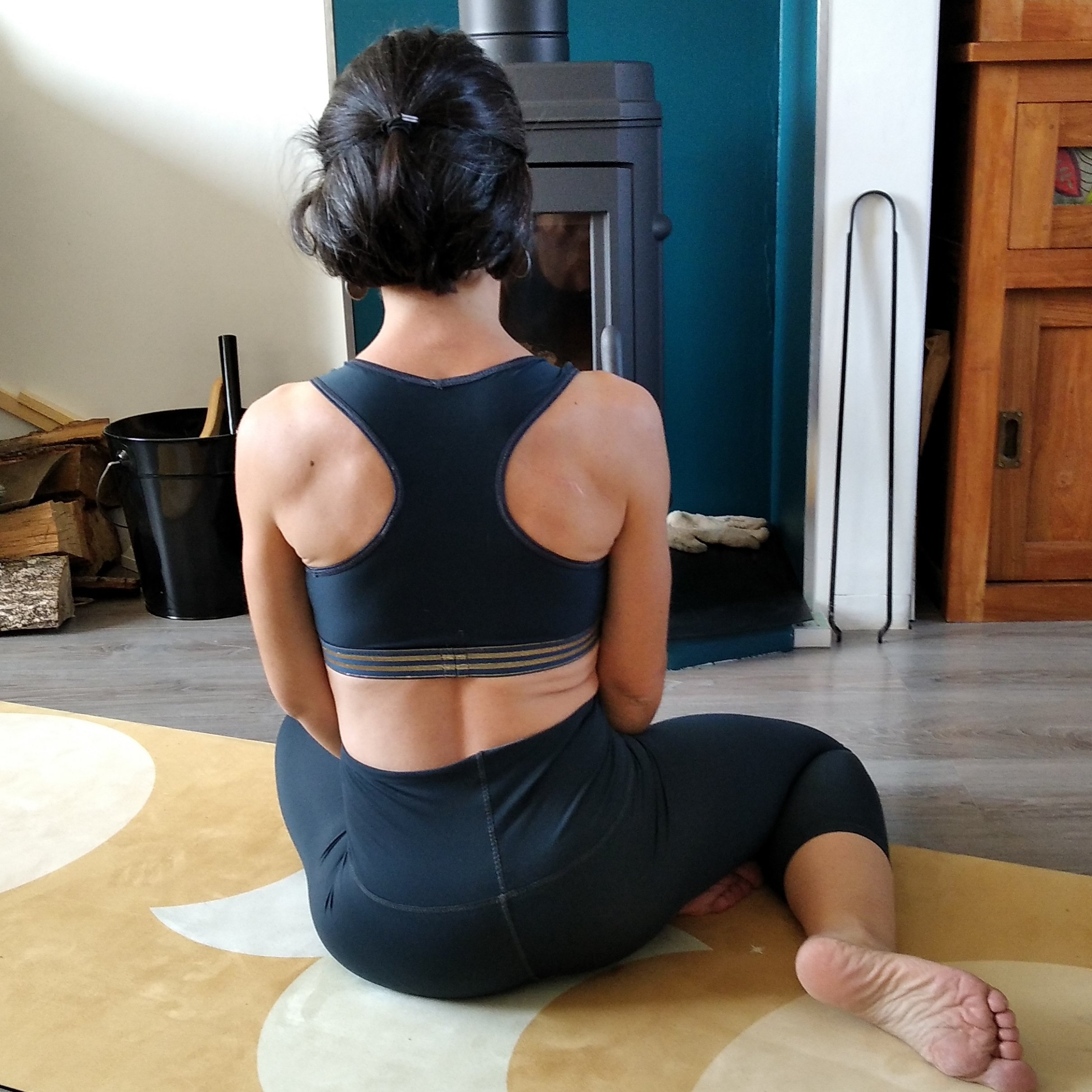 J’ai pu tester et approuver cette tenue mercredi dernier lors de ma séance hebdomadaire de yoga. Je dois vous dire que j’avais un tee-shirt au dessus de la brassière car à mon (grand) âge, j’ai finalement peu envie de montrer mon ventre ! Mais pour vous montrer l’ensemble de cette tenue, j’ai demandé à mon mari quelques photos !