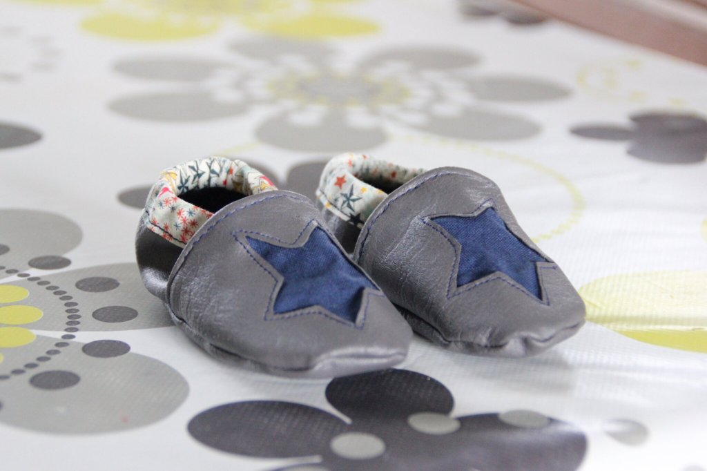 Les chaussons pour bébé étaient à une époque le cadeau de naissance. Pas vraiment de la couture débutant car c’est très minutieux de coudre la coulisse pour passer l’élastique et plus on coud des petites pièces, plus c’est difficile. Il existe sans doute de nombreux modèles mais j’utilisais celui de Petit citron en faisant une petite variation sur le dessus avec un appliqué inversé.