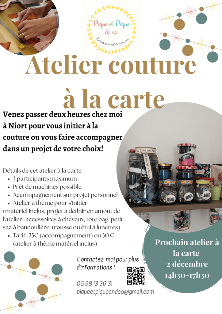 Vous êtes à Niort ou aux alentours (dans un rayon de 15 kilomètresàà et vous avez envie d’apprendre à coudre ou d’offrir un atelier couture à un.e ami.e, un.e enfant, un.e ado…